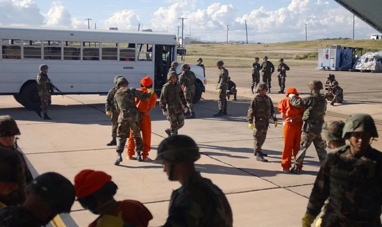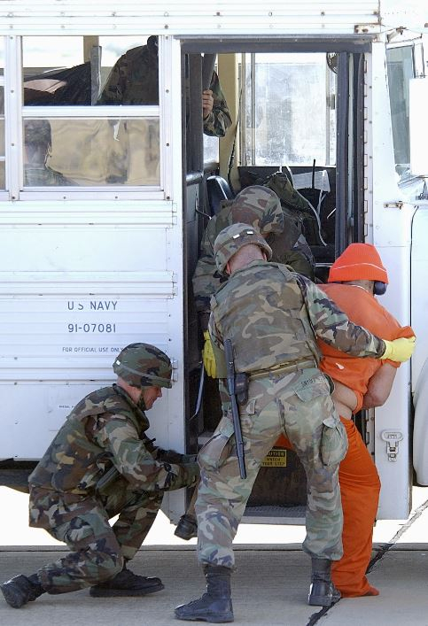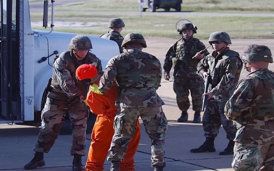 照片显示,这些囚犯在整个押运过程中被戴上手铐和脚镣,抵达时由全副武装的海军陆战队负责交接。