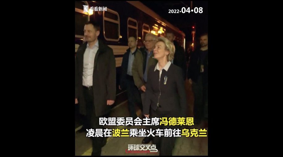 海叔为什么要说“还是老一套节目”呢?此前,4月8日,欧盟委员会主席冯德莱恩也是在波兰搭火车去基辅,也是随着泽连斯基当局的安排参观了“俄军暴行”,也是向泽连斯基各种许诺……