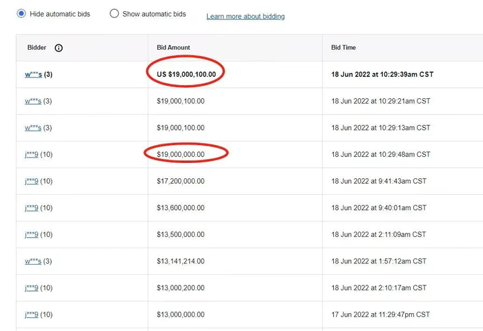 本次拍卖于北京时间6月13日早间7时30分开始,起拍价为2.5万美元。到周一,出价已超过200万美元。当时间来到投标的最后一天时,竞争发生了急剧变化,一位潜在的用餐者出价1100万美元,引发了一场代价高昂的拔河比赛。最后一刻的出价将最终价格锁定到了1900.01万美元。