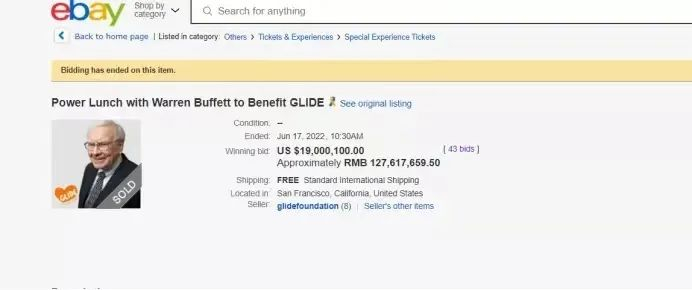 当地时间6月17日22点30分,经过5天43轮出价,2022年巴菲特慈善午餐在eBay网站以1900.01万美元(约合人民币1.28亿元)成交。