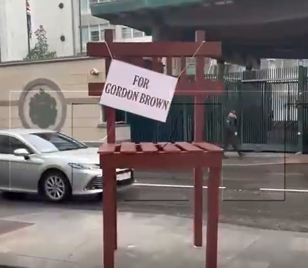 而布朗称普京“威胁”他一事也遭到了俄罗斯网民的嘲讽,近日,该国一些活动人士专门在莫斯科的英国驻俄使馆前为戈登·布朗摆放了一把2.5米高的椅子,其喊话布朗,“2.5米够高了吗? ”