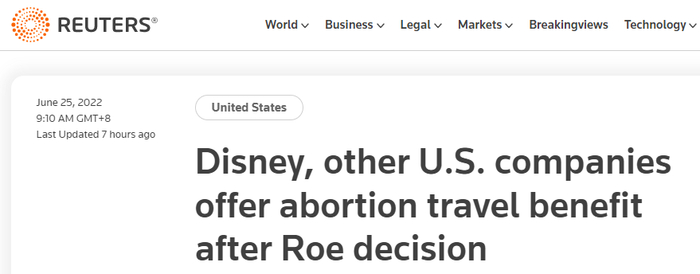 (观察者网讯)据路透社当地时间6月24日报道,在美国最高法院推翻“罗诉韦德案”判决——正式取缔对女性堕胎权的宪法保障后,迪士尼、脸书母公司Meta、网飞(Netflix)、华纳兄弟探索频道等美国公司当天均表示,如果员工不得不前往异地寻求堕胎服务,他们将报销差旅费用。