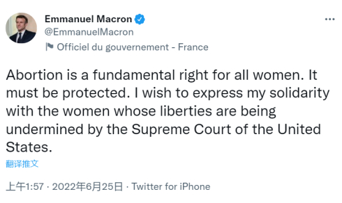 报道称,还有最近再次当选法国总统的马克龙,他在推特上发文称:“堕胎是所有女性的基本权利。它必须得到保护。 我想表达我对被美国最高法院剥夺自由的女性的声援。”↓
