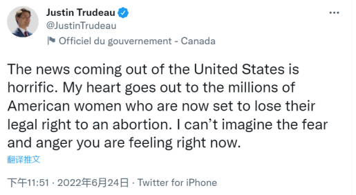 加拿大总理特鲁多当天发推就此事回应称:“来自美国的消息是可怕的。我的心与数百万即将失去堕胎合法权的美国女性同在。我无法想象你们现在的恐惧和愤怒。”↓