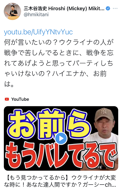 东谷义和并没有在直播中说出具体人物的姓名,“Business Journal”称,随后,在网络上便有人开始猜测“M社长”到底是谁。不过,报道称,就在27日,三木谷突然在推特上引用了东谷有关视频并称:“你想说什么?在乌克兰人因战争受苦的时候,开派对让她们忘掉战争有什么错?你是苍蝇吗?”