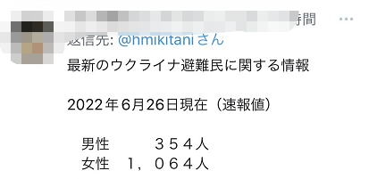 关于三木谷“现在男性乌克兰人无法出国”这种说法,还有人称:“根据最新消息,截至26日,有354名男性乌克兰人避难到日本。”↓