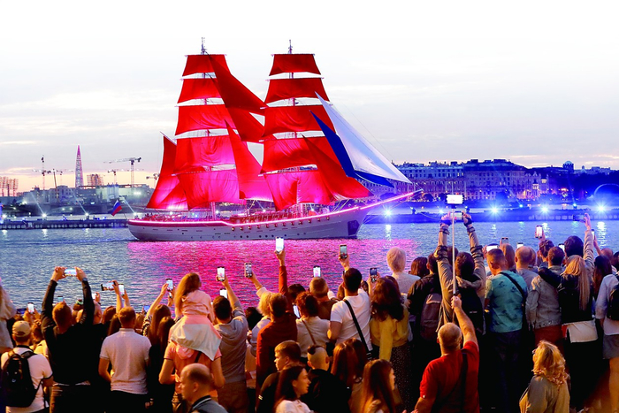 “红帆节”是俄罗斯中学毕业生的节日,每年在圣彼得堡庆祝,通常在夏至前的最后一个周六举办,今年的举办时间是在6月24日晚至25日凌晨。笔者的朋友董道明就读于圣彼得堡国立大学,作为一名摄影爱好者,当晚他与一支华人摄影爱好小分队端上“长枪短炮”,早早地就占据了有利地点,调好快门,准备捕捉红帆驶过的画面。他告诉笔者,现场热闹非凡,涅瓦河两岸站满了人,可以说是人山人海,摩肩接踵。每年的“红帆节”是圣彼得堡最浪漫、也是最热闹的节日,不仅是中学毕业生,许多城市居民和外国游客也渴望一睹“梦想之船”的风采。“红帆”早已成为这座“北方之都”的名片之一。