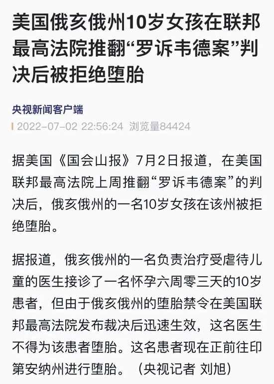 央视新闻消息,据美国《国会山报》7月2日报道,俄亥俄州的一名负责治疗受虐待儿童的医生接诊了一名怀孕六周零三天的10岁患者,但因该州的堕胎禁令已经生效,女孩正前往印第安纳州进行堕胎。