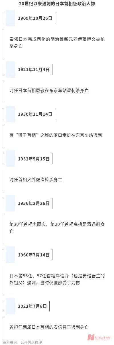 《每日经济新闻》记者注意到,政治人物遇刺的事件在日本历史上并非罕见。日本近代出现了多次现任或卸任首相遇刺,但大多在二战之前。二战之后遇刺的首相级人物,仅有岸信介和安倍晋三,而岸信介是安倍晋三的外祖父。