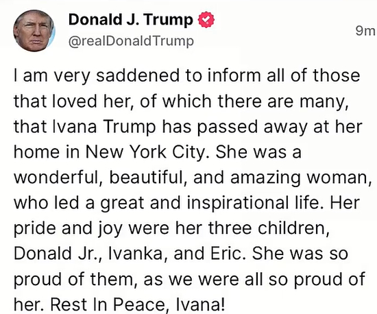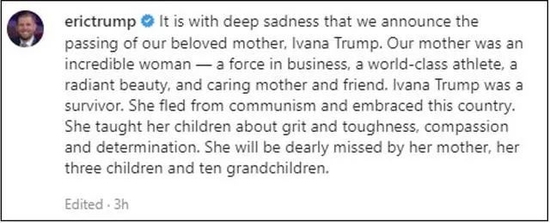 伊万娜的二儿子埃里克·特朗普在Instagram上代表特朗普家庭发帖说,他的母亲是 “商界的巨人,世界级的运动员,光芒四射的美女,以及充满爱心的母亲和朋友”,并教导“她的孩子们勇气和韧性、同情心和决心。她的母亲、她的三个孩子和十个孙子都会深深地怀念她。”