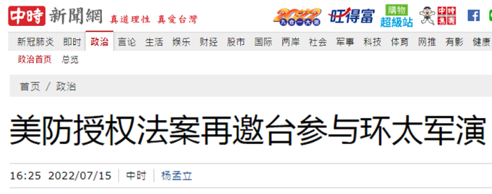 据台湾“中时新闻网”消息,美东时间7月14日,美国联邦众议院院会表决通过了《2023会计年度国防授权法案》,又提到“邀请台湾地区参与2024年的环太军演”。