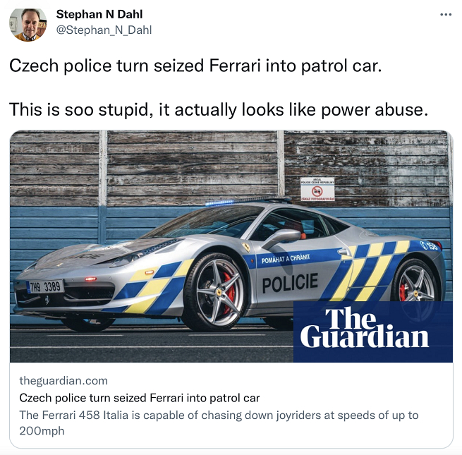 “以前海盗也这么干”!捷克警方将缴获的法拉利改装成警车惹争议