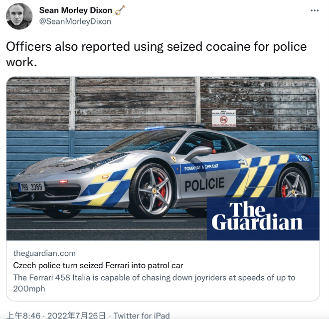 《卫报》称,同一车型的法拉利售价高达15万英镑,不过捷克警方强调,这辆跑车并不是买来的奢侈品,他们对其进行了改装,花费约为10300英镑(约8万人民币)。