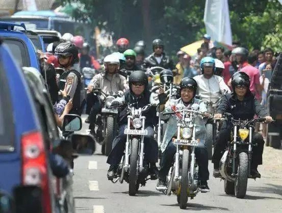 他还经常带领内阁人员骑着摩托车编队出游,吸引了无数印尼年轻人的目光↓↓