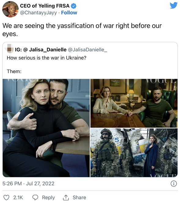 还有人说:“在《VOGUE》工作的每个人都应该立即加入乌克兰外籍部队。”