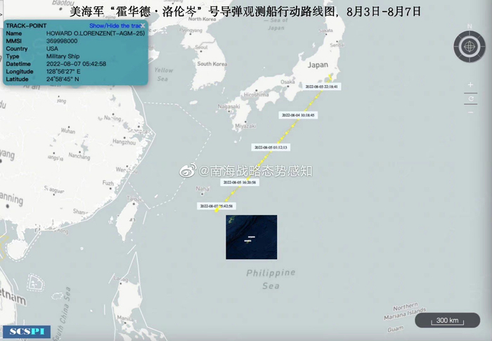 据@南海战略态势感知 消息,“霍华德·洛伦岑”号导弹测量船(Howard O. Lorenzen,T-AGM-25)在8月3日从日本横须贺港出发,于8月7日到达冲绳附近海域,推测已进入侦察阵位。其搭载的CJR雷达系统主要包括两部大型S、X波段相控阵雷达,具备广域搜索、目标捕获、识别、多目标处理和精确监视能力。
