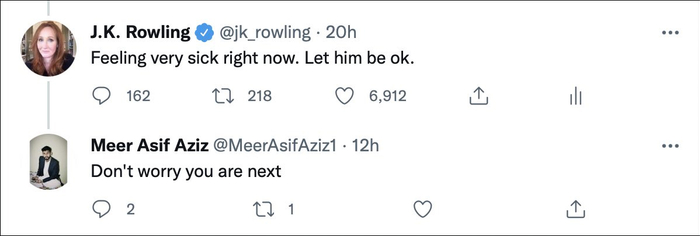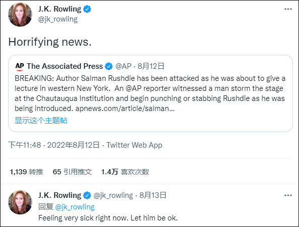 在拉什迪遇袭当日,罗琳转发了相关消息,并评论道,“恐怖的新闻,很恶心,希望他一切都好。”