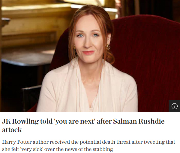 (观察者网讯)综合每日电讯报、独立报等英媒当地时间13日报道,在对印度裔作家萨尔曼·拉什迪遇袭一事发声后,英国作家、《哈利·波特》作者J.K。罗琳收到了潜在的死亡威胁,对方称,“你是下一个”。目前,英国警方已介入此事。