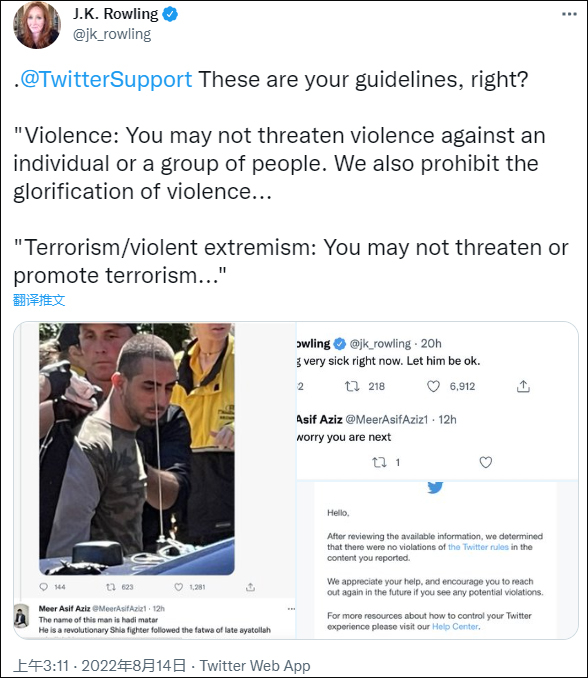 罗琳隔空喊话Twitter,“这是你们的指导方针吧?暴力:不得威胁对个人或群体实施暴力,我们也禁止美化暴力;恐怖主义/暴力极端主义:你不得威胁或鼓吹恐怖主义。”