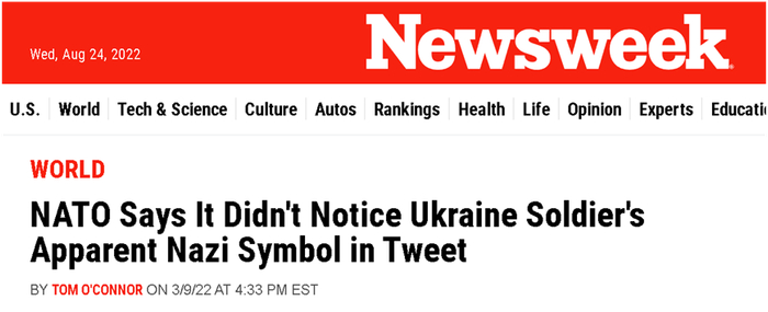比如,在今年3月8日,北约组织在社交账号上发帖给乌克兰女兵做宣传时,就被人发现其中一名女兵佩戴着纳粹的“黑太阳”(Sonnenrad)徽记。北约随后删除了这则帖文,并辩解说他们没有注意到女兵身上的这个徽记。