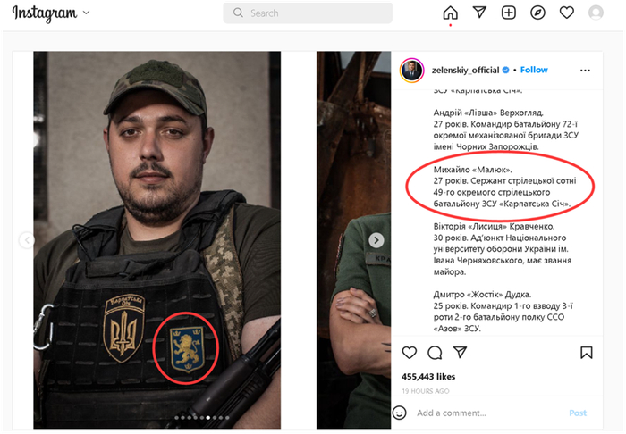 (图为乌克兰总统泽连斯基在乌克兰独立日当天贴出的一组士兵照片,其中图中这名士兵的胸前的一个狮子形状的徽记引发了争议)