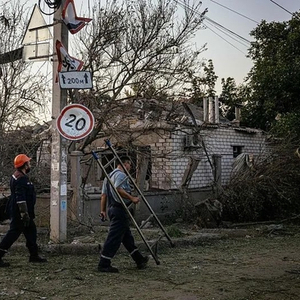 29日,乌克兰尼古拉耶夫,市政服务人员走过导弹袭击后被摧毁的房屋。图源:视觉中国