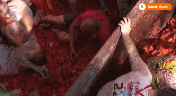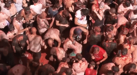 整个小镇中心变成了“西红柿的海洋”,“子弹”不足的参与者们甚至趴在地上在西红柿泥里展开激战,砸到最后每个人看起来都筋疲力尽。