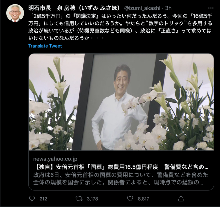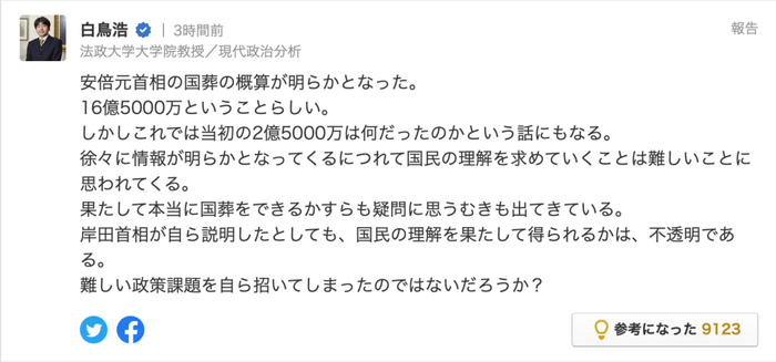 ↑政法大学教授·白鸟浩:前首相安倍晋三的国葬预算已经公开了。据说是16.5亿日元。然而,这让人不禁要问,原来说的“2.5亿日元”又是什么呢。