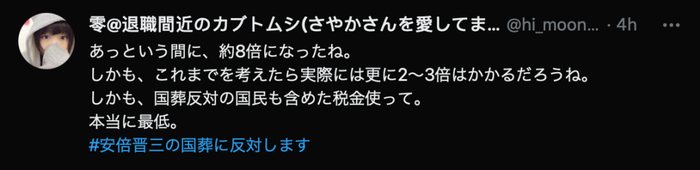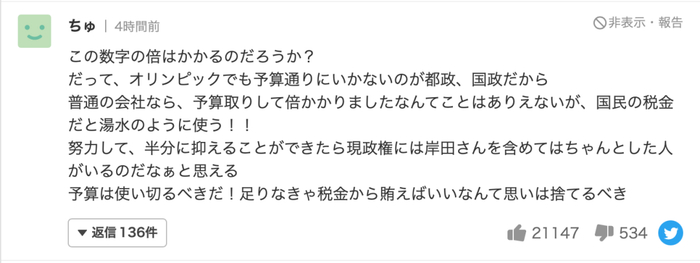 ↑网友:转眼间这钱怎么是原来的8倍的。而且,实际上可能会比这个数字还要再多个2~3倍吧。不仅如此,还要用那些“反对国葬”的国民上缴的税款,真的太差劲了。