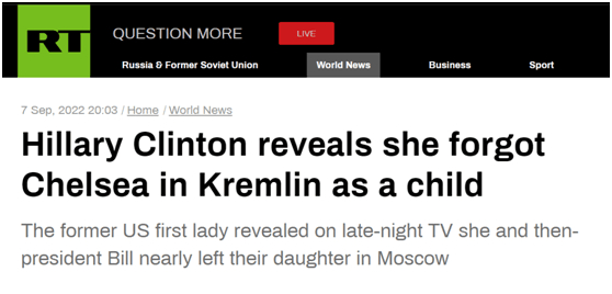 RT说,在回答美媒主持人吉米·法伦有关自己“疯狂的假期故事”的问题时,希拉里讲起了上述这段经历。报道称,希拉里自认这段经历让她“非常痛苦”,她称当时她和丈夫与时任俄罗斯总统叶利钦进行了会面,当他们准备乘车前往机场时,突然意识到自己的女儿切尔西没有在场。报道说,希拉里没有解释她和丈夫是如何突然发现女儿不见了的。