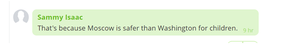 还有人认为,发生这种事“是因为对孩子们来说,莫斯科比华盛顿更安全”。↓