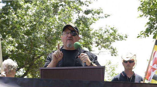 ↑“誓言守护者”创始人斯图尔特·罗德斯(中)在2017年的一场集会上发言