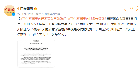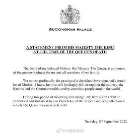 据英国白金汉宫8日消息,刚刚成为英国国王的查尔斯表达了对已去世的英女王伊丽莎白二世的致敬。他将今天描述为“对我和我的所有家庭成员来说最悲伤的时刻”。白金汉宫8日证实,英女王伊丽莎白二世当天去世,终年96岁。