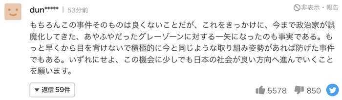 另一方面,也有人说道:“事件本身当然不是好事,但这件事成为射中日本政治家掩盖的灰色地带的一根箭,这也是事实。如果(自民党)以前就像现在这样表现出积极解决问题的姿态,而不是避而不谈,那就可以避免事件发生。无论如何,希望以此为契机,日本社会能够稍微向好的方向发展。”