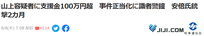 另一方面,时事通讯社报道称,有学者认为,应该将山上因个人怨恨而犯罪与“统一教”问题当成两件事分开思考。日本犯罪心理学专家出口保行称:“从家庭环境等因素考虑,(山上)得到出于同情的支援是说得通的。”不过,他还强调,“这并不代表他可以犯罪,不能说犯罪是正当的”。