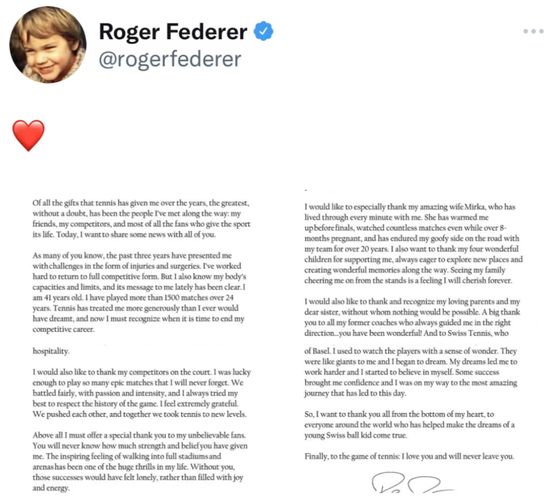 当晚我正走在回家路上,通过编辑发来的消息获知了这个讯息。先是略感诧异。虽然罗杰已经缺席正式赛事一年多,退役传闻也传了几次,但是真到听到他的决定,还是觉得有些不真实。