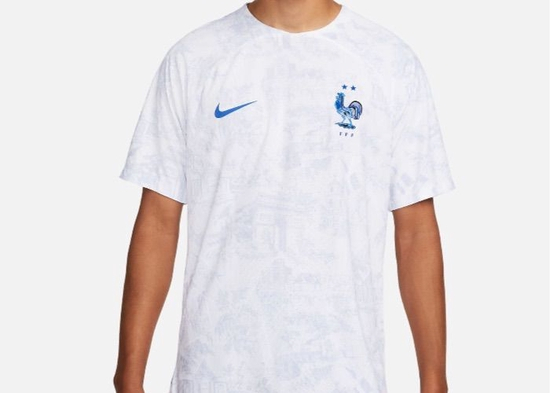 图片来源:耐克官方网站法国队的客场球衣以白色为底色,搭配海军蓝纹理,特色之处在于球衣上经典的法国Toile de Jouy织物印花,这些暗纹印花描绘着法国的历史及地标建筑,包括凯旋门、法国足球大本营克莱枫丹等。