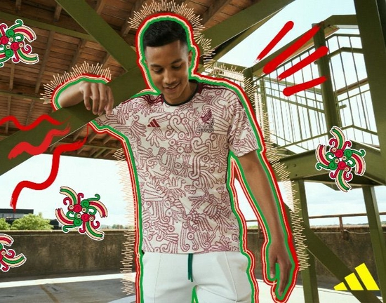 图片来源:阿迪达斯官方微博同样的,墨西哥队客场球衣的印花也取材当地文化,海螺壳(Caracol)、权杖(Bastón)新火(Fuego Nuevo)和螺旋线(Voluta)等文化符号成为设计元素。用料方面,该球衣的球员版使用了 50% 的Parley Ocean Plastic环保材质;球迷版则采用了AEROREADY面料。新球衣已于8月31日墨西哥队对阵巴拉圭队的友谊赛中首次登场。