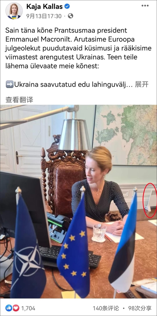 据RT9月24日称,发现卡拉斯使用电热器的媒体是“Uued Uudised”。在本月15日,“Uued Uudised”在其网站报道称,卡拉斯13日在社交媒体分享了一张照片,展示她与法国总统马克龙通话,但照片的一角却显示,总理办公室的墙边多了一个用来额外供暖的电热器。