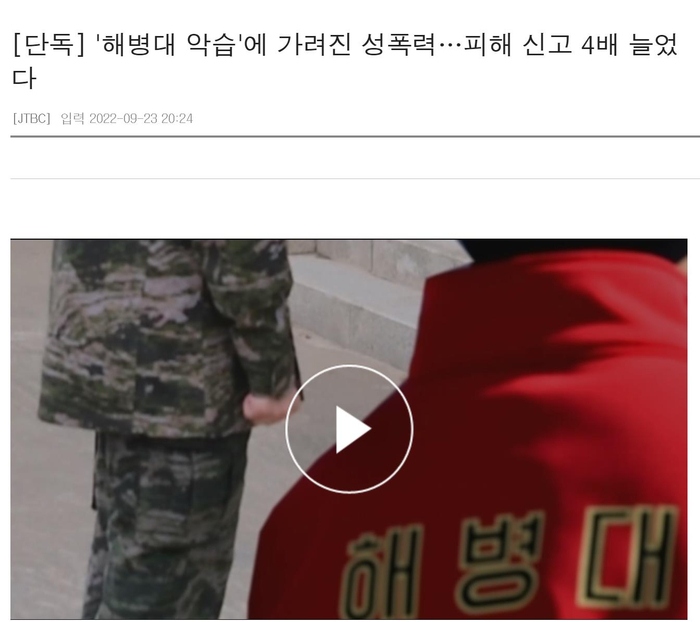 JTBC电视台在报道中称,去年2月,一名19岁的海军陆战队士兵曾在洗澡时被上级士兵当场命令立定后保持站军姿状态。听到命令后,这名士兵不得不停止洗澡,转而站直不动。接着,上级士兵开始对其进行猥亵,这名小士兵在整个过程中都不被允许动弹或发出声音。此后,该上级士兵被举报,于今年6月因涉嫌性骚扰被韩国法院判处有期徒刑2年6个月,缓期3年执行。