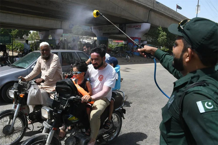 2022年5月15日,在巴基斯坦南部经济中心卡拉奇,一名志愿者在街头向行人喷水,以帮助抵御高达51摄氏度的热浪(视觉中国 供图)