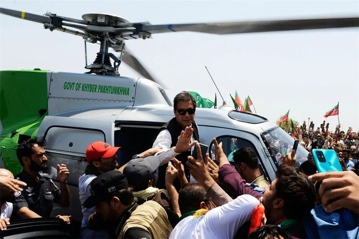 2022年5月25日,巴基斯坦前总理伊姆兰·汗(中)乘坐直升机抵达斯瓦比,准备和数千名支持者一起前往首都伊斯兰堡进行抗议示威(人民视觉 供图)