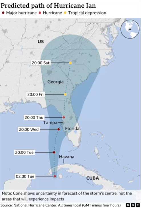 飓风“伊恩”在当天早上登陆古巴后继续向美国佛罗里达州移动。