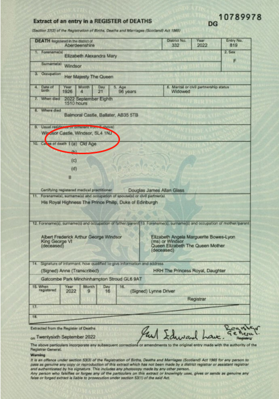[环球时报综合报道]据英国广播公司(BBC)29日报道,英国苏格兰国家档案馆公布的死亡证明显示,英国女王伊丽莎白二世于当地时间9月8日下午3时10分因“年迈”去世。这份文件由女王的女儿安妮公主签署,她在女王去世前的24小时都陪在女王身边。安妮公主此前曾在一份声明中说:“我很荣幸能陪伴我最亲爱的母亲度过她生命的最后24小时。”