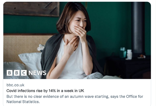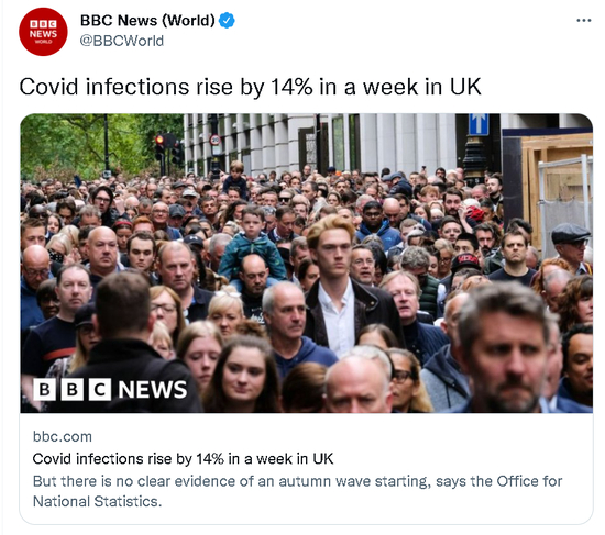 如下图所示,BBC于当地时间9月30日发布了一则关于英国疫情形势的新闻报道,这则报道的标题是:英国的新冠病毒感染人数在一周内增加了14%。