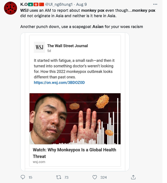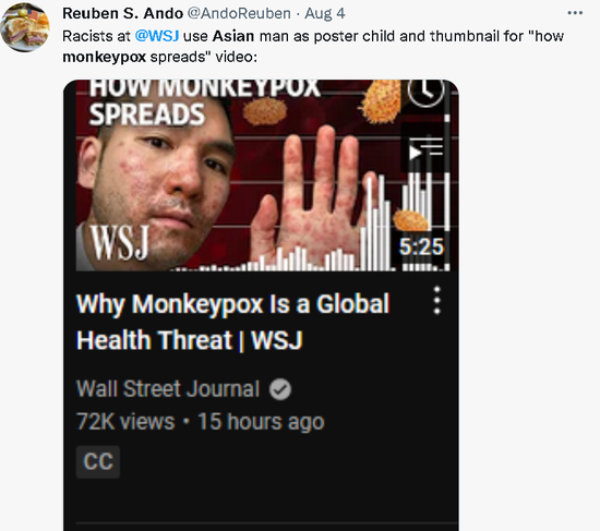 另一方面,在报道传染病时被质疑滥用亚裔图片的媒体,并不只有BBC一家。美国《华尔街日报》今年8月发布一则关于猴痘病毒的视频报道,就因为将一名满脸和满手都是疱疹的亚裔男子作为报道的封面图,而在境外的社交网络上引起了广泛质疑。