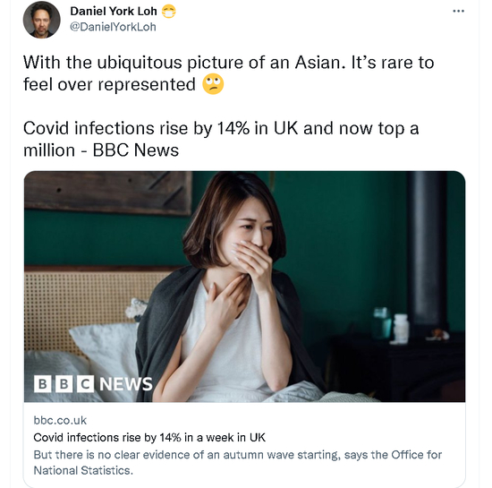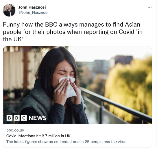 因为他们发现,这则讲述英国国内新冠疫情形势恶化的新闻,BBC居然配了一个亚洲女子的照片作为报道的封面图。