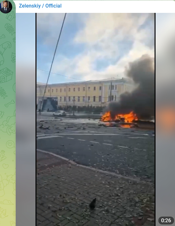 乌克兰多座城市遭到袭击之际,泽连斯基迅速在社交媒体上发文,谴责俄罗斯“试图摧毁我们,把我们从地球上抹去”。泽连斯基还在社交平台Telegram上发布了一段视频,曝光基辅遭袭后的画面。↓
