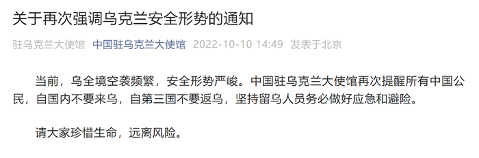 中国驻乌克兰大使馆10日发布消息称,当前,乌全境空袭频繁,安全形势严峻。中国驻乌克兰大使馆再次提醒所有中国公民,自国内不要来乌,自第三国不要返乌,坚持留乌人员务必做好应急和避险。请大家珍惜生命,远离风险。