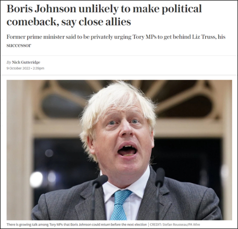 9月,在和媒体谈到“约翰逊是否会在继任者下台时,以党首身份重返政坛”时,伦敦玛丽女王大学政治学教授蒂姆·贝尔曾表示,保守党只有在“相当走投无路”的情况下才会吃回头草。
